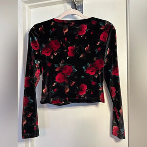 Better than fresh flowers, the style of our floral stretch-velvet Rowenna blouse lasts forever. The cropped top features a V-neck, twists, cutouts, and long slim sleeves.