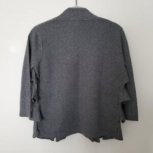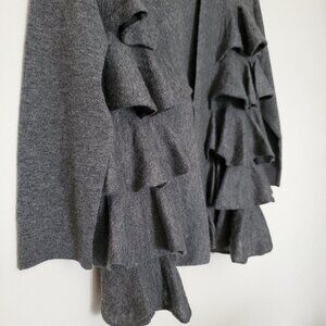 This brand-new, unworn cardigan is crafted from luxuriously soft, 100% Italian cashmere. It features 3/4 sleeves and a hook-and-eye closure for a clean, seamless look. The front is detailed with delicate ruffles that add a feminine touch, while the chic, sophisticated grey color offers versatile elegance.