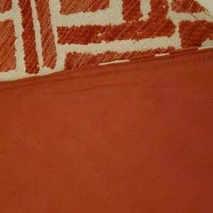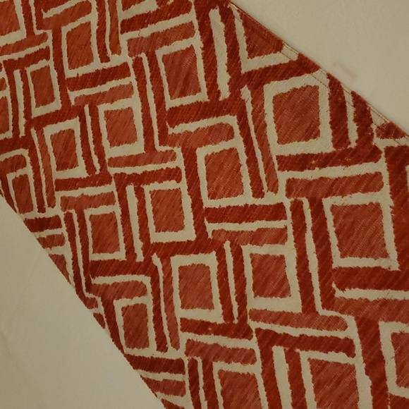 Burnt orange and cream. Never used not a good match for my dining room chairs. Nice weight..not thin. Fabric is woven and the unit is solid on the back. Displayed on six seater table.