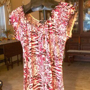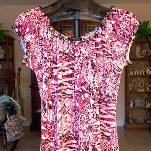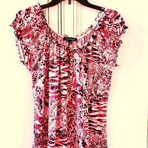 This is an Ava & Grace Scoop Neck Blouse in a missy size large. It has only been worn a few times and is in excellent condition. The fabrication is 97% poly and 3% spandex. It has an elasticized neckline and elasticized cap sleeves. The colors are a pretty mix of pink, rose, raspberry and black. It is very lightweight, has a good bit of stretch and has a very soft feel. Machine wash cold and lay flat to dry. It measures about 21 inches across under the arm and about 27 inches from the shoulder to the hem. This is a very cute top that would look great with jeans or capris. Or you could wear it with nice pants out to dinner, or under a jacket for work. However you wear it, you will just love it.