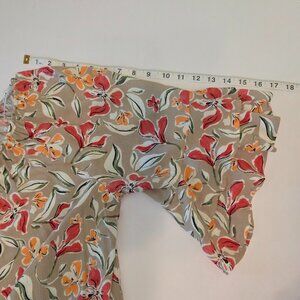 Beautiful Ava & Viv blouse featuring a cheerful floral print in red, orange, and ivory on a warm beige background.
