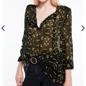 The Rodeo blouse from Ba&sh is designed in a khaki, black and yellow geometric printed viscose chiffon crepe, featuring: