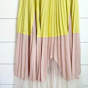 NWOT BCBC Maxazria Lucea yellow and tan dress with white sheer mesh bottom. This is such a beautiful and unique dress. S o many cute details. Love the white sheer mesh about the bust line. It is pleated throughout with the white sheer mesh hanging out of the bottom part. Perfect pop of color. Could be worn for any special occasion or dressed down with a jean jacket. New without tags. Size 0