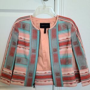A boho-luxe cape jacket, tailored from a sturdy jacquard blend and highlighted by a chinle-inspired print.