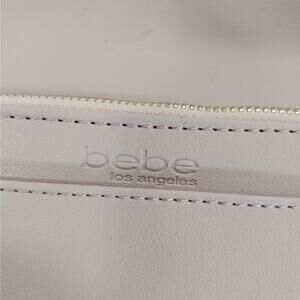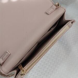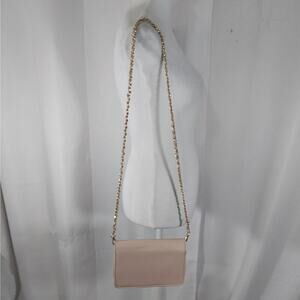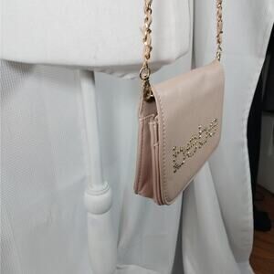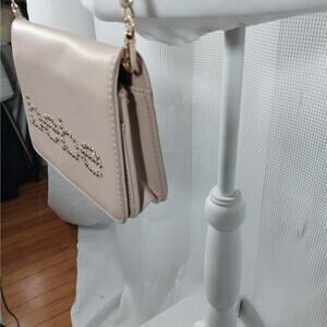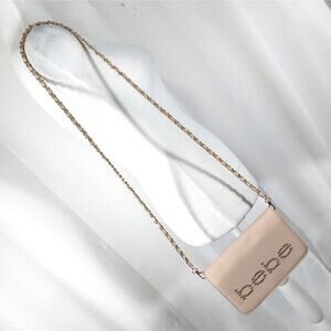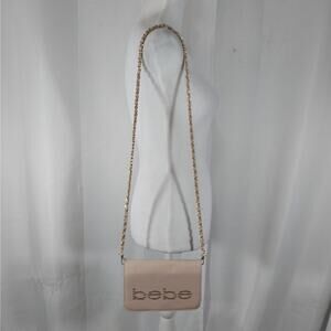 From Bebe, this mini purse, crossbody, bag is just too sweet in baby pink! Studded in front with glittering rhinestone "diamonds," it spells out the logo, "Bebe!" Flap and snap top closure, Inside: 1 compartment with zipper compartment & front slide pocket! Woven gold chain strap at 44" with a 19.5" drop, removable so it can double as a clutch or even a wallet! Measures 7.5" x 5" x 1", Note: there is one tiny nick at the side sewn edge, plz see pix, thus the super price! Otherwise: ***NEW Without Tags, and Guaranteed Superb by Lily @HauteClub!*