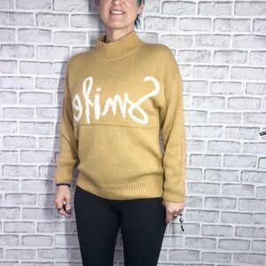 New condition. Soft mustard yellow/tan sweater with 'Smile' with a heart across the front, which, makes me smile, and I love all things with hearts, so I love it! :) No size tag, but I'm usually a small-medium and it's a bit bog on me, and the chest measures approximately 20 inches across pit to pit so I'm listing as a size Large.