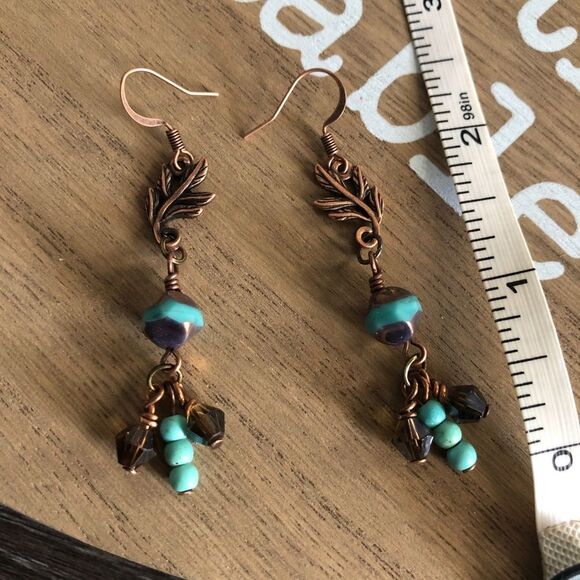 New without tags rustic boho earrings made with antique copper colored metals, Czech glass, crystals, and turquoise colored stones. Copper colored hooks are nickel and lead free. Approximate length of earrings is 2.5” including ear wires.