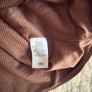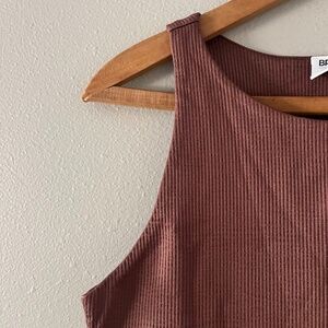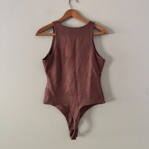 Thickknit with shapewear/scuba compression. Brown ribbed. Slight racer back style with snap crotch closure. Size medium with approximate measurements laying flat of 16" chest and 28" length (shoulder to crotch). In like new used condition from a smoke-free, dog friendly home.