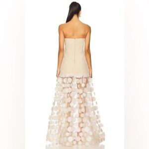 Stunning cream strapless gown featuring a unique textured skirt. Perfect for formal occasions.