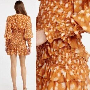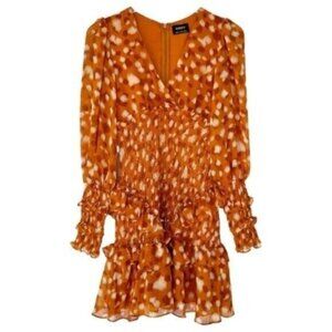 NWOT Bambina dress by Bardot. Orange and white spotted print called Sketchspot. Featuring a flattering v neckline, shirred waist to create the perfect silhouette and fun frill hemline for when you want to dance the night away. Long sleeves. Smocked bodice and sleeve cuffs. Ruffle detailing. Hidden back zipper. Mini length. Brand new without tags!