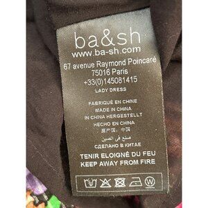 This Ba&sh floral midi dress features a vibrant multicolor pattern, making it a stylish choice for spring and summer. The dress has a ruffled V-neckline and elbow sleeves, adding an elegant touch. It's made from lightweight fabric for comfort and breathability, ideal for warm weather.