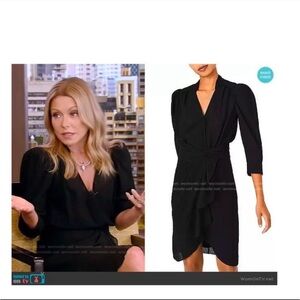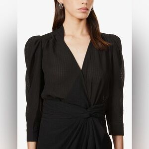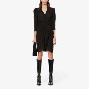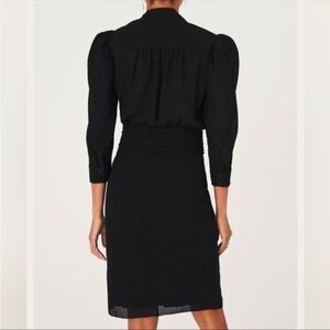 Slip-on this black ensemble and the styling possibilities are truly endless. It’s a versatile piece with a v shape neckline, padded shoulders, and long puffy sleeves with button cuffs. Created with a blend of polyester and elastane, the slim fit dress is gathered at the waist. It also has a short skirt with a fun asymmetric hem and an overall high-class vibe.