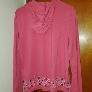 NWOT Be Inspired brand light weight hooded long sleeve shirt. Shirt is a carnation pink with a cute pink, white and black design around the bottom of the hoodie. Has full front zip.
