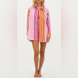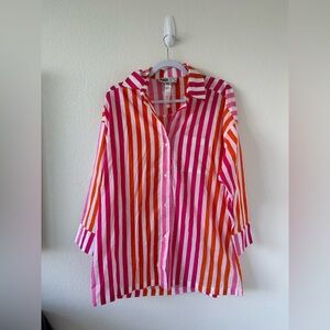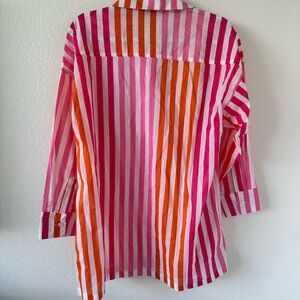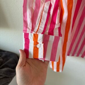 Vibrant striped button-up shirt in pink and orange. Perfect for a bold, stylish look.