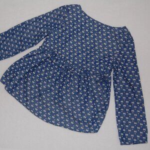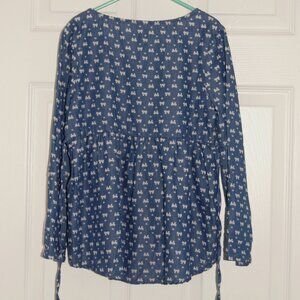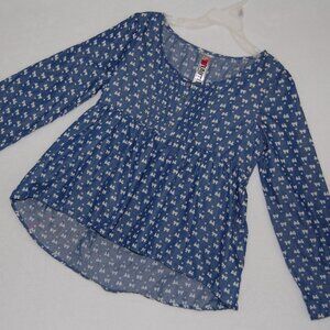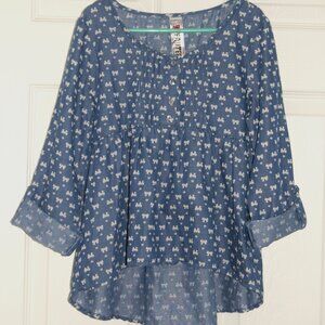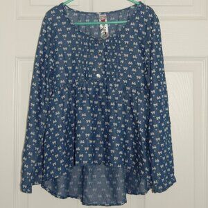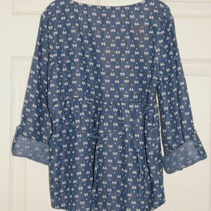 Features: Long sleeve with foldable hem, 4-button henley, pleated robe, high-low, curved hem at back, tie-back.