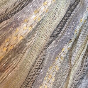 This can go with so many colors worn many ways. Received as gift, need to sell. Delicate weave metallic weave as well. Fringe at the bottom. Length 68” width 24”.