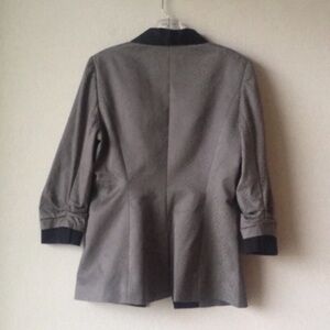 Grey snakeskin print with black trimmed sleeves and lapels. Single button and 3/4 length sleeves with ruching.