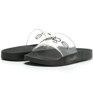 NWOT Bebe Dahlia Clear Size 9 Slides Sandals Black Spellout Large