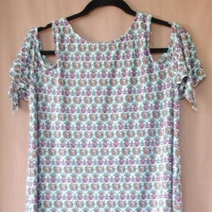 Midi-length tent dress with flirty cold shoulder sleeves. Cut in a smooth, flowy material in a vibrant multicolor paisley/floral print that'll be sure to liven up your day! Perfect for sorority events, summer evenings, or travel outings (it's easy to pack with no need for ironing!).