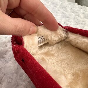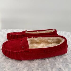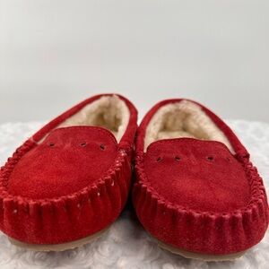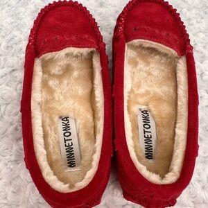 NWOT Berry Colored Suede Minnetonka Faux Fur Slippers. So Soft and comfy shoes! Because of the rubber sole you can wear these out of the house! Color is showing up as more red than in person. These are a berry color and BNWOT SOZE 6M. They don’t have the accent wrap around trim and bow, just fyi