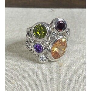 This product is a stunning silver plated ring featuring multiple colored cubic zirconia stones. The ring is designed with a bezel setting and has a size 9. The vibrant colors of the cubic zirconia stones add a touch of sparkle and glamour to any outfit, making it a versatile and eye-catching piece of jewelry. Perfect for adding a touch of elegance to any ensemble, this ring is sure to make a statement.