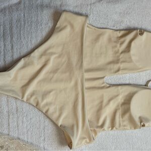 Beautiful one piece bikini has an open back and strings that tie around the neck. The cover-up is a beautiful lace detail with glimmer thread and floral pattern.