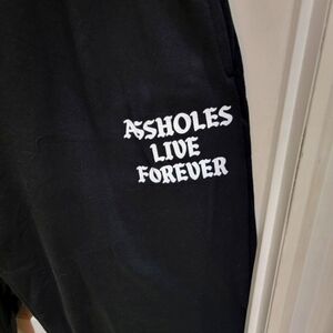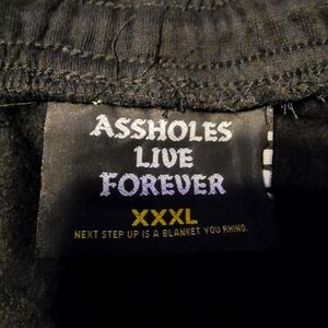 Brand new pair of black Assholes Live Forever sweat pants with draw string. Has two pockets to keep your items secure and your hands warm. The logo is a white silk screen on the left leg. Size 3XL. 60% cotton and 30% Polyester. The cooler season is coming. Get your armies now.