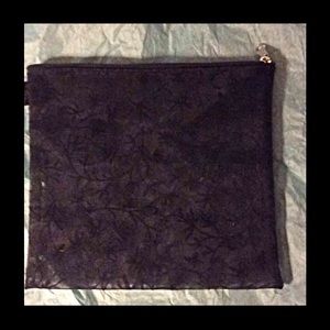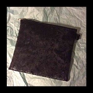 NWOT Black makeup bag with black velvet lace design. Do not know the brand, come from a set from QVC or HSN. Not benefit. Great size for a cosmetic bag if you don't carry anything but the necessities. Will measure.