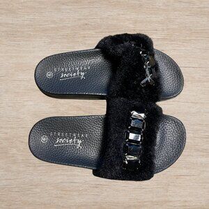 NWOT Black Slides Slippers Fuzzy Faux Fur Glam Rhinestones Women’s Sz 6