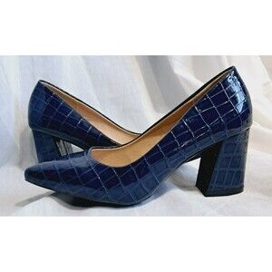 NWOT Blue Croc Faux Patent Leather Chunky Block Heel Pointed Toe Size 37 US 6.5