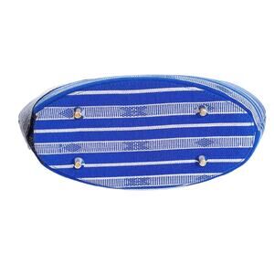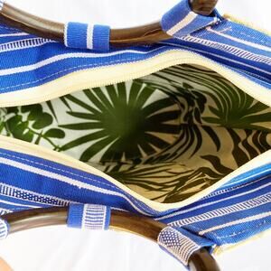 NWOT Blue Handmade Handwoven Fabric Straw Double Wooden Handle Tote Handbag