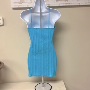 This striking blue mini dress features a ribbed texture and a bodycon fit, perfect for a night out. The sleeveless design with spaghetti straps adds a touch of elegance, while the vibrant color ensures you stand out. Its form-fitting silhouette and mini length make it a bold choice for cocktail events.