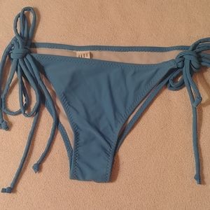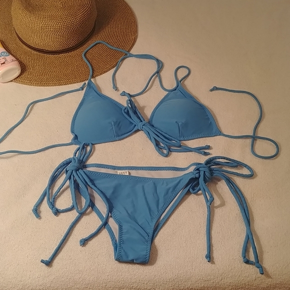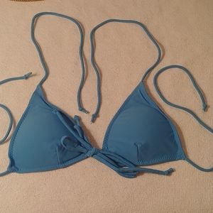 The top ties in the back, as a halter, and in the front in a bow. There is some fraying on the tie ends which can be seen in the pictures.