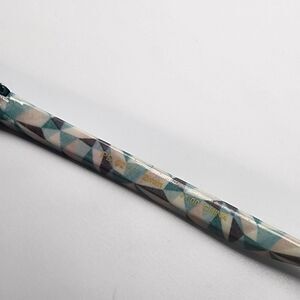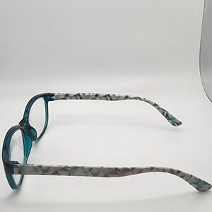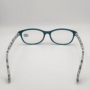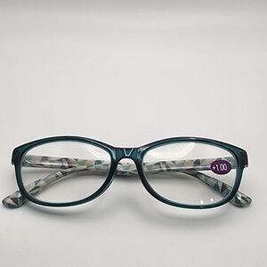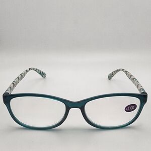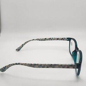 New without tags. Blue +1.00 reading glasses with blue, white, and gray geometric patterned arms.