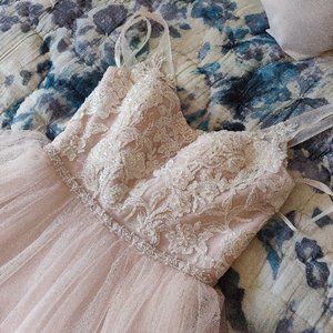 NWOT: Blush / Cashmere Pearl Beaded Lace & Tulle Ballgown with Ribbon Belt