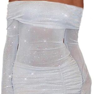 Features: Mesh sheer ruched bodycon mini dress for women, featured off shoulder neck, flared sleeve, long sleeve, ruched dress, sparkly, bodycon slim fit, help show your curvy figure