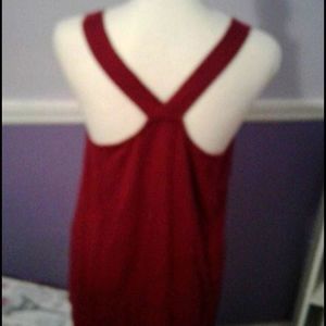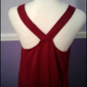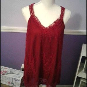 Burgundy laced overlay babydoll style top. V-neck with lace trim on the neckline and straps. Top layer has a beautiful floral lace on the front. Fully lined. Shell is 100% cotton with a 100% nylon base, contrast fabric is 65% polyester and 35% rayon, and lining is 100% polyester.