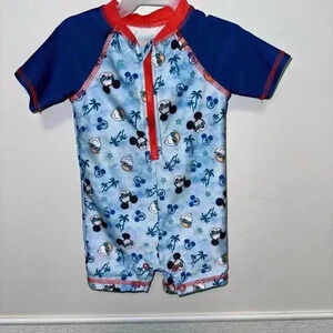 This is a new, Disney Baby brand, short-sleeved, one-piece swimsuit for a baby boy. It is blue with a red trim and features a full-front zipper closure. The swimsuit has a blue and white pattern with Mickey Mouse wearing sunglasses and palm trees. The swimsuit is made of a soft, stretchy material and is in excellent condition. It has no tags or box. The size is 6-9 Months.