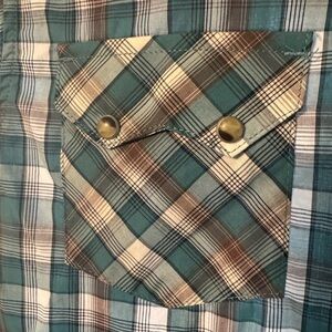 NWOT Wrangler Retro Western L shirt. This long-sleeved shirt features a classic plaid pattern in shades of turquoise, white, and gray. It has a full button-up front with snap closures, two chest pockets with snap-closure flaps, and a pointed collar. The shirt is designed with a western-inspired aesthetic. Excellent used condition.