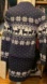 Cozy navy long sleeve sweater dress with white reindeers and snowflakes pattern. Perfect for winter and holiday season.