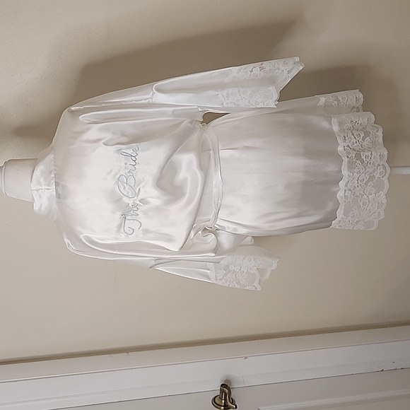 Never Worn, from Bloomingdale's. Beautiful silk bridal robe with blue stitching on the back and lace trim.