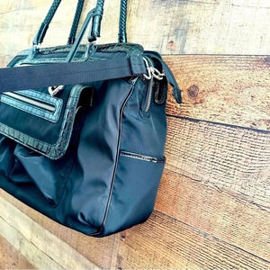 STUDY LIGHT WEIGHT WATER RESISTANT NYLON WITH PATENT LEATHER CROC EMBOSSED TRIM AND TONS OF SILVER HARDWEAR AND POCKETS GALORE FOR ULTIMATE ORGANIZATION.