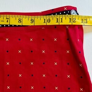 Crisp red with navy ribbon at waist, Side zipper with button closure, Adjustable waist, Unlined, Cotton/spandex, MSRP $65.