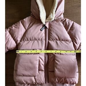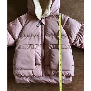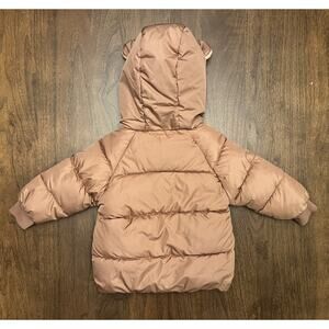 Puffy yet lightweight brown bear coat. No brand tag, purchased from Amazon. Size purchased was listed at 12-18 month size but it is closer to the size of 2T coats (see measurements). Color is coffee brown with a tint of pink/mauve/orange. Hood is sherpa lined fleece with bear ears. Front has 2 functional open pockets that are attached on the top but flap up and down from the bottom (see photo). Again, this is puffy but lightweight. Never worn.