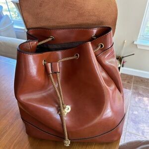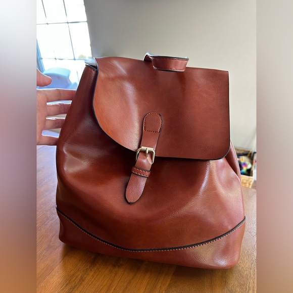 NWOT brown faux leather backpack purse with gold accents. Perfect for daily use and travel! Dimensions: 13.5in x 12in x 6in