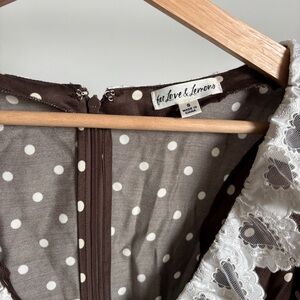 Charming brown mini dress with white polka dots. Features heart lace trim and a bow detail. Perfect for a playful look. Love the dropped waist style and voluminous sleeves! Unlined. Back zip closure.