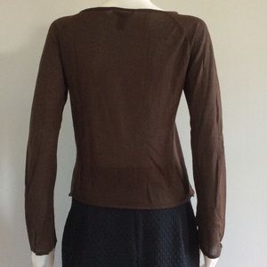 Boho brown knit top with crochet detail at chest, semi-sheer fabric, and slight bell sleeves.