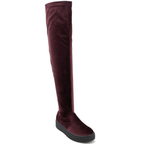 NWOT Olivia Miller 'Lynbrook' Velvet Over the Knee Boot Brand New Olivia Miller Burgundy Velvet Over the Knee Boot, 8.5 Versatile sneaker boots w/ sneaker flat-form bottom & soft velvet design over the knee shaft Inside zip closure, padded footbed & round toe 100% Polyester upper/lining w/ TPR outsole Never worn-No box Thanks for looking!!!