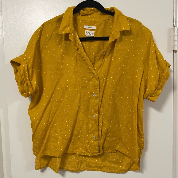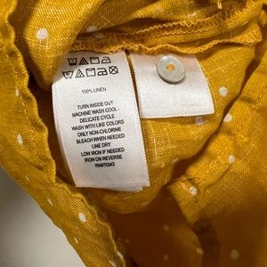 This adorable mustard yellow button down top has a mixture of white and light pink polka dots. It’s made of linen so it has a lived in, comfy look. It’s the perfect top to add a pop of color to your outfit.