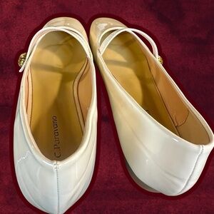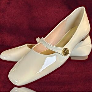 NWOT C. Paravano Cream Patent Square-Toe Mary Jane Flats with Gold Buttons Sz 41